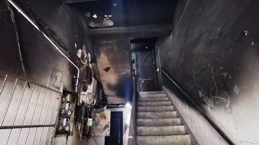 消防员到场几分钟后就扑灭了明火,起火的是停放在一楼楼道里的两辆电动自行车,都已烧得只剩骨架残骸。 “我听说,3楼一个小年轻本来也想冲出去的,后来因为房门打不开躲过一劫。”马岩说,如果冲出去,估计也是凶多吉少,“毕竟几百度的高温烟气,人吸几口就不行了”。